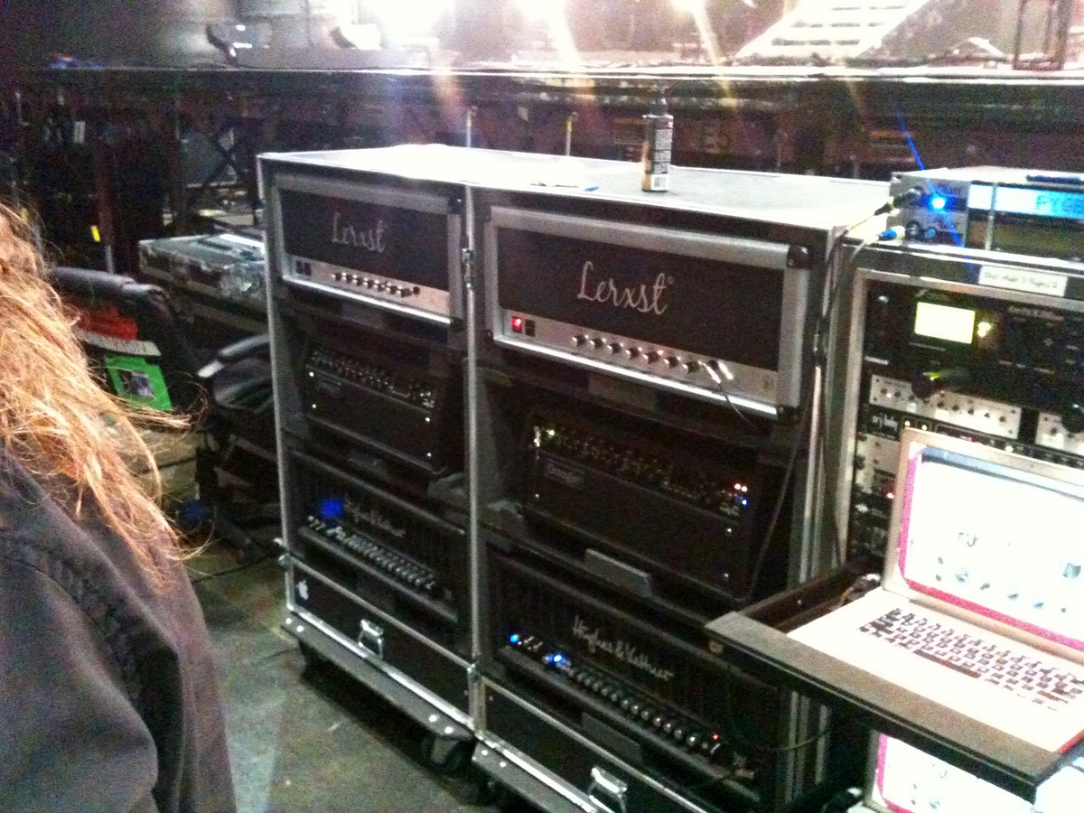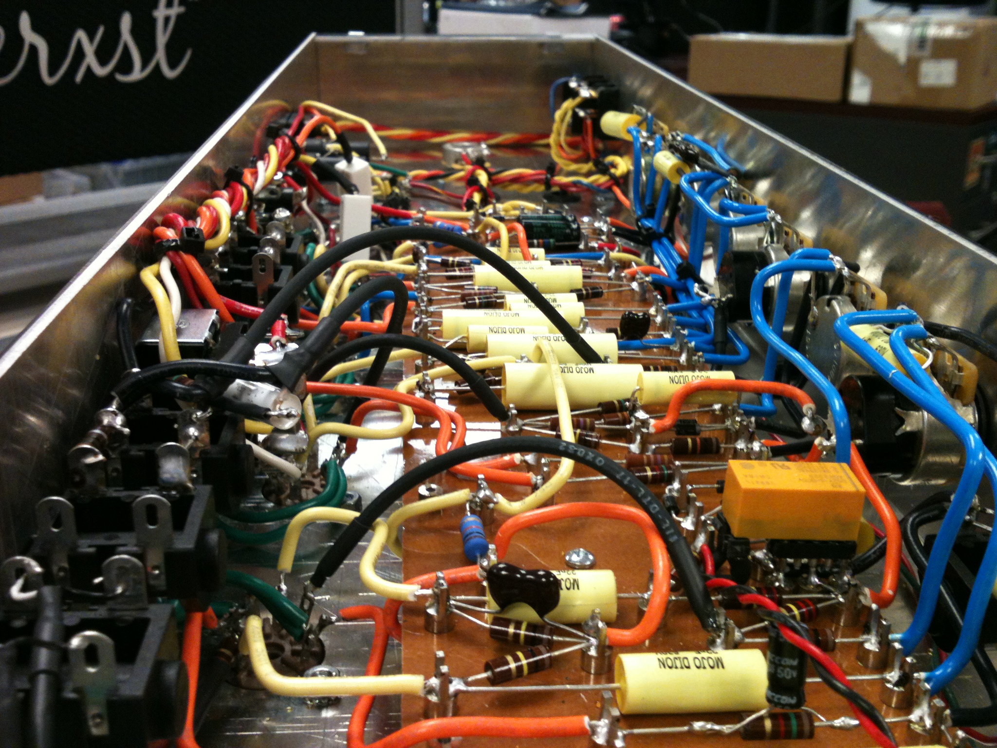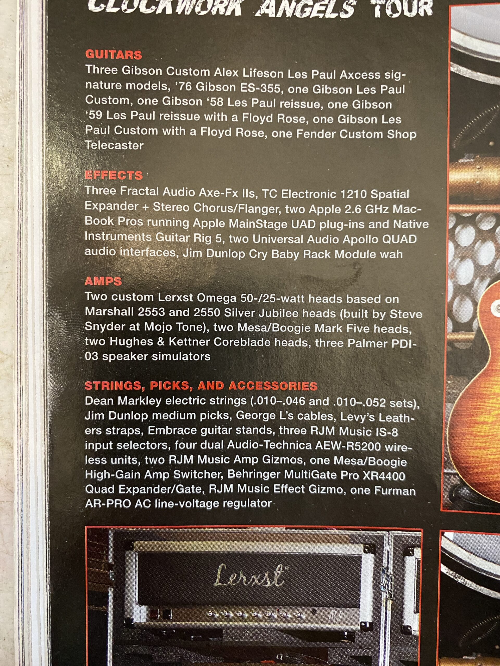 During my time with Mojotone, I developed three amplifier models for the Lerxst line of amplifiers for Alex Lifeson of Rush. In August of 2012, Alex was getting ready to go on the road for the Clockwork Angels tour cycle and wanted to use a Marshall Silver Jubilee for his main drive sound. During the recording of Clockwork Angels, he used a 2554 Silver Jubilee to track his guitar parts in the studio. Most of the amps he could find were either in rough shape and not really roadworthy, or they were priced very high on the used market. So he contacted Mojotone, where I worked at the time, to see if they could build one with some tweaks. I started with a JCM800-style chassis and Heyboer iron, built the amp on a turret board using carbon comp resistors, Mojo Dijon caps (mustard style), and CTS pots. The first amp, #001, was built over the course of a few long days. Then, in the late hours of a Thursday, the amp roared to life with a unique growl that shook the room! The next day, #001 was sent to their tour rehearsal space. Alex and Scotty plugged in the amp and A/B’d it with an old Jubilee they had there. The Jubilee was moved to a backup for #001. He loved the amp and asked for a second one to be built as a backup. So, a week later, #002 was shipped out to him. Both #001 and #002 were used on the Clockwork Angels and R40 tours for all of Alex’s main overdrive sounds. I caught up with Scotty at one point, and he mentioned that #001 never went down for either tour.