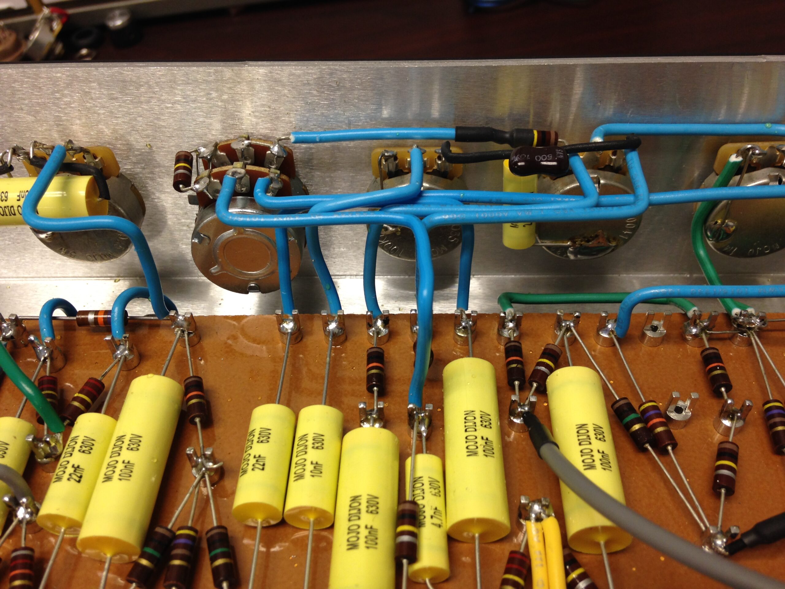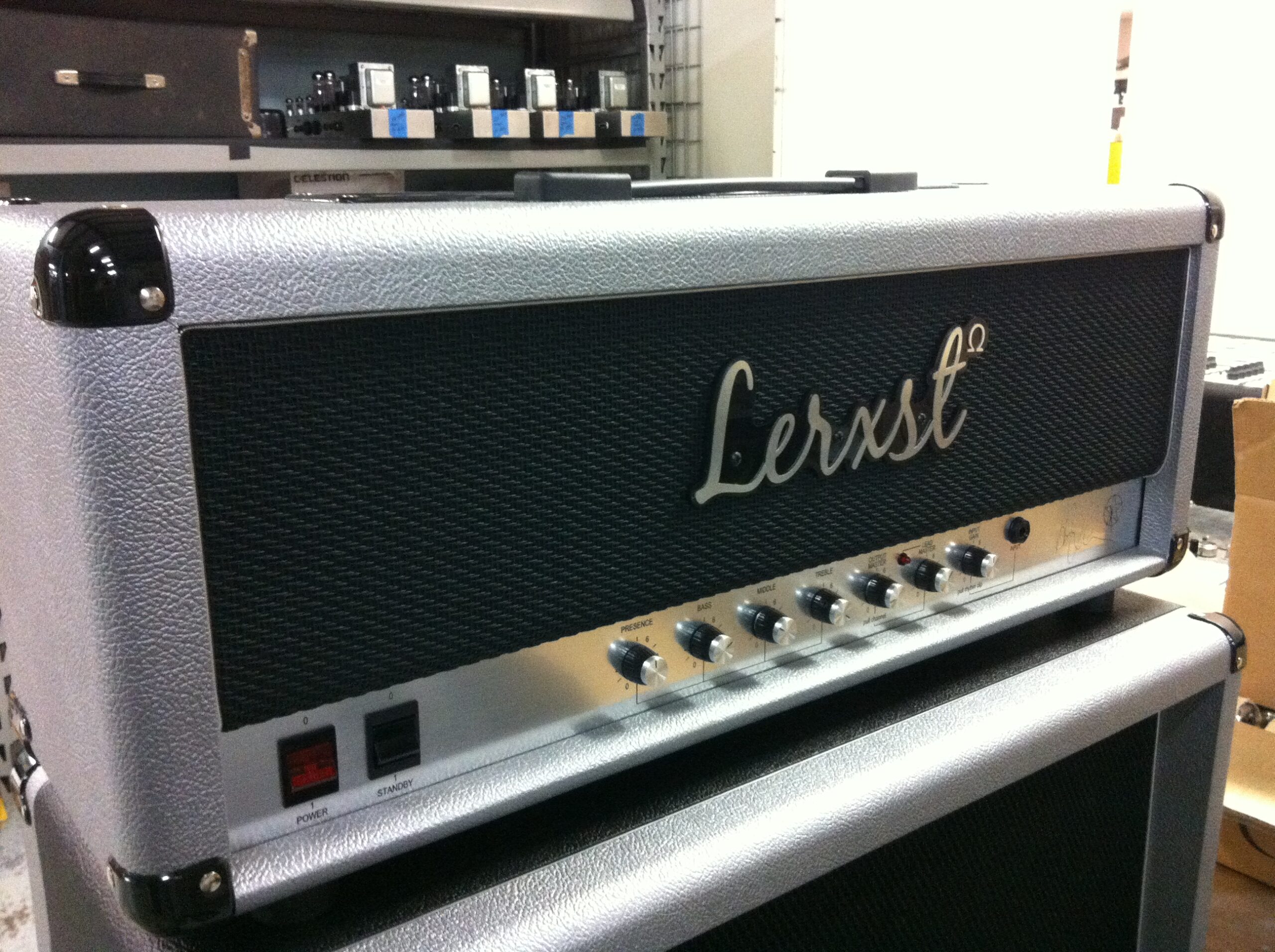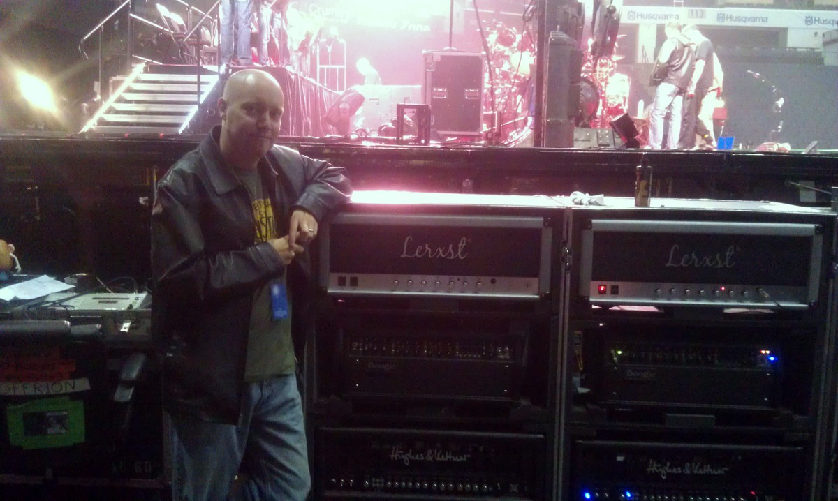 During my time with Mojotone, I developed three amplifier models for the Lerxst line of amplifiers for Alex Lifeson of Rush. In August of 2012, Alex was getting ready to go on the road for the Clockwork Angels tour cycle and wanted to use a Marshall Silver Jubilee for his main drive sound. During the recording of Clockwork Angels, he used a 2554 Silver Jubilee to track his guitar parts in the studio. Most of the amps he could find were either in rough shape and not really roadworthy, or they were priced very high on the used market. So he contacted Mojotone, where I worked at the time, to see if they could build one with some tweaks. I started with a JCM800-style chassis and Heyboer iron, built the amp on a turret board using carbon comp resistors, Mojo Dijon caps (mustard style), and CTS pots. The first amp, #001, was built over the course of a few long days. Then, in the late hours of a Thursday, the amp roared to life with a unique growl that shook the room! The next day, #001 was sent to their tour rehearsal space. Alex and Scotty plugged in the amp and A/B’d it with an old Jubilee they had there. The Jubilee was moved to a backup for #001. He loved the amp and asked for a second one to be built as a backup. So, a week later, #002 was shipped out to him. Both #001 and #002 were used on the Clockwork Angels and R40 tours for all of Alex’s main overdrive sounds. I caught up with Scotty at one point, and he mentioned that #001 never went down for either tour.