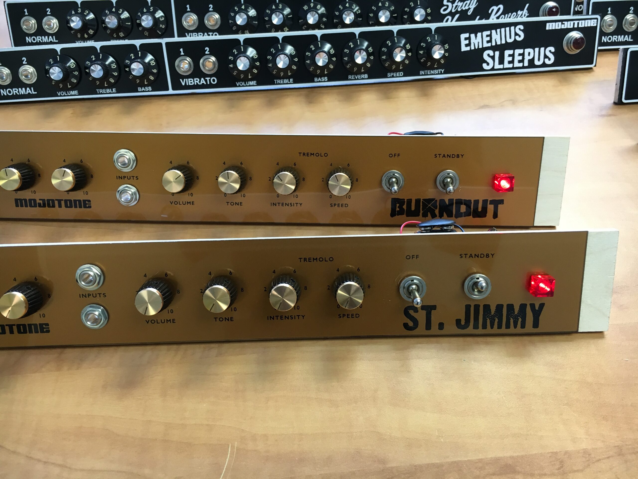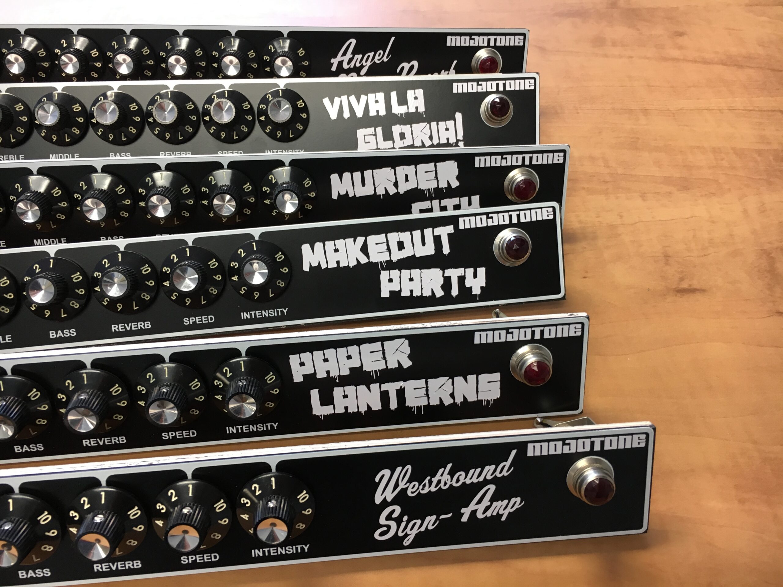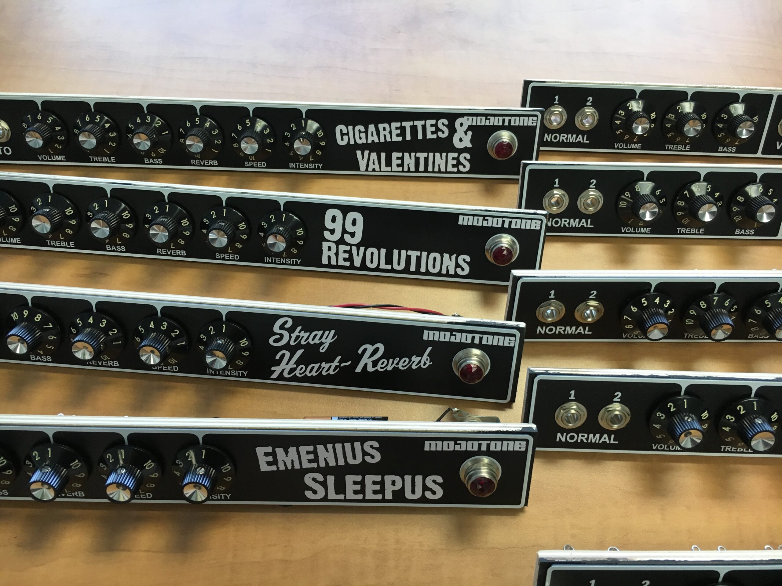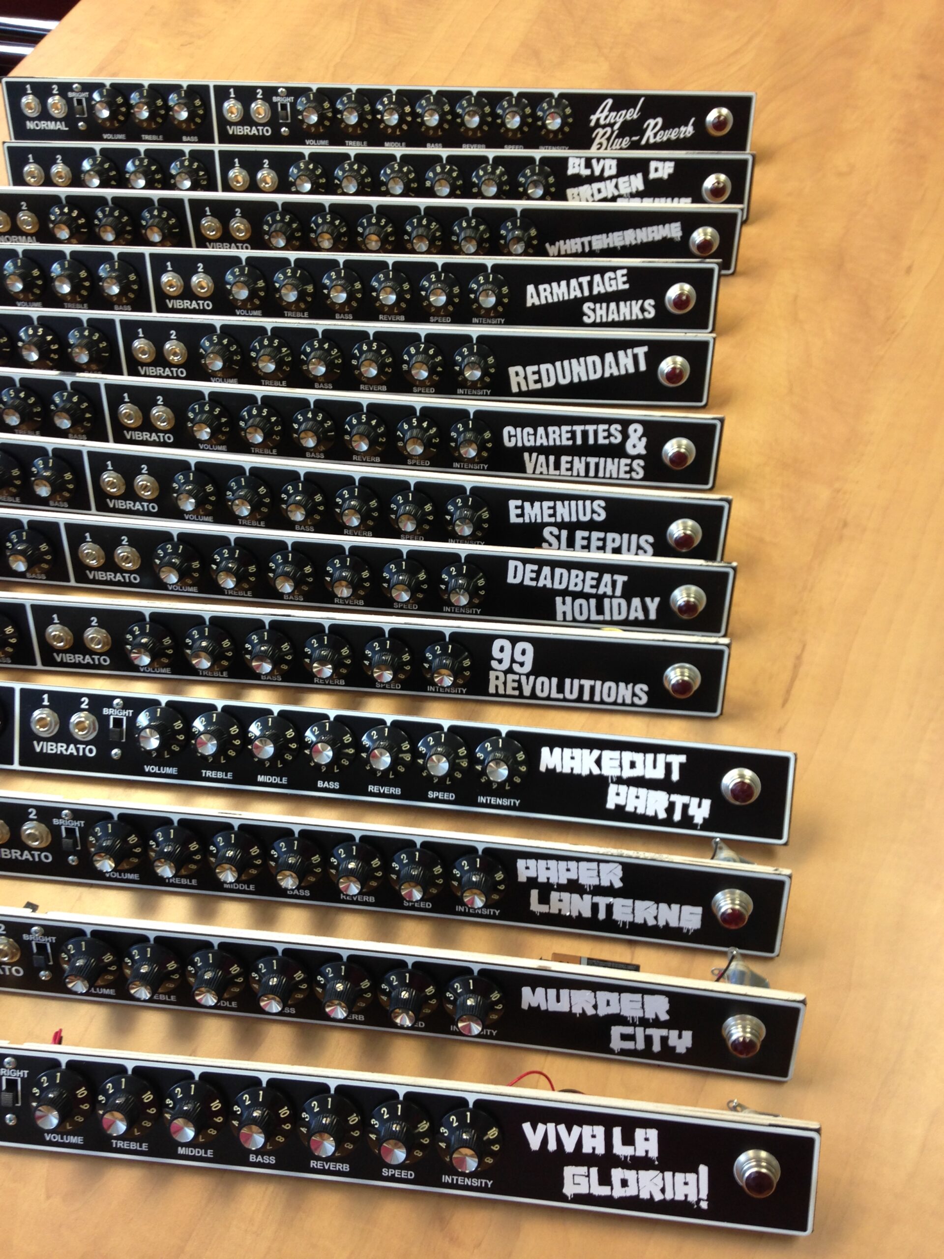Just before Green Day took off on their big tour supporting the Revolution Radio album, they decided to do a smaller run of shows, including TV appearances. They wanted to have a pawn shop feel to their stage look, so they reached out to Mojotone, requesting a bunch of random cabinets that looked like they had been amps found in pawn shops. The ones where you could see a chassis or faceplate needed to have some sort of chassis to make the amp look real, as well as a functioning pilot light. I helped with the assembly and designing of some of the custom faceplates. Instead of putting amp names like “Deluxe Reverb,” each one had a Green Day song reference as the amplifier model, using various fonts that matched the Green Day album they were from.