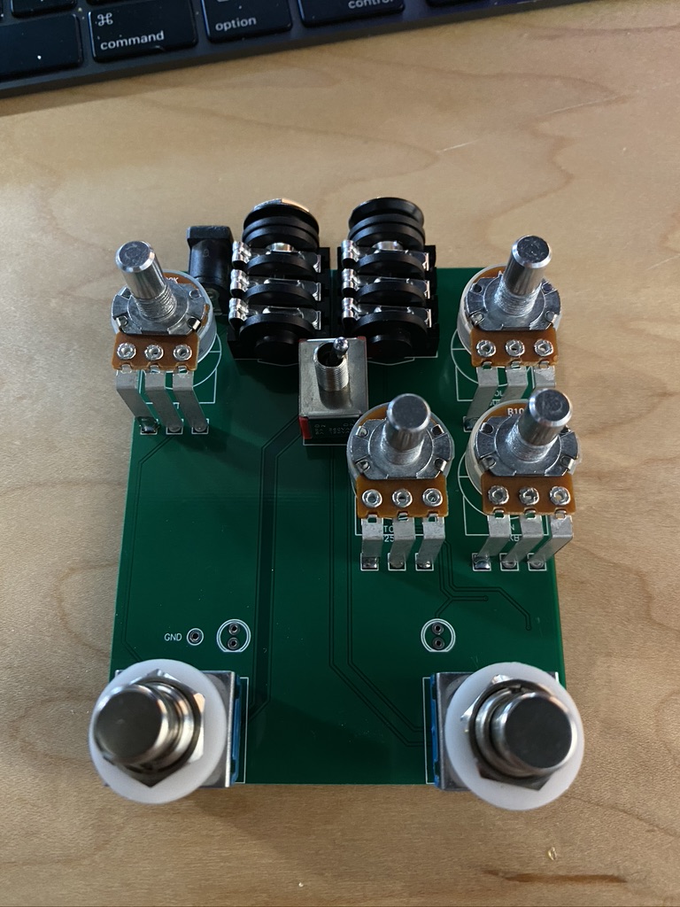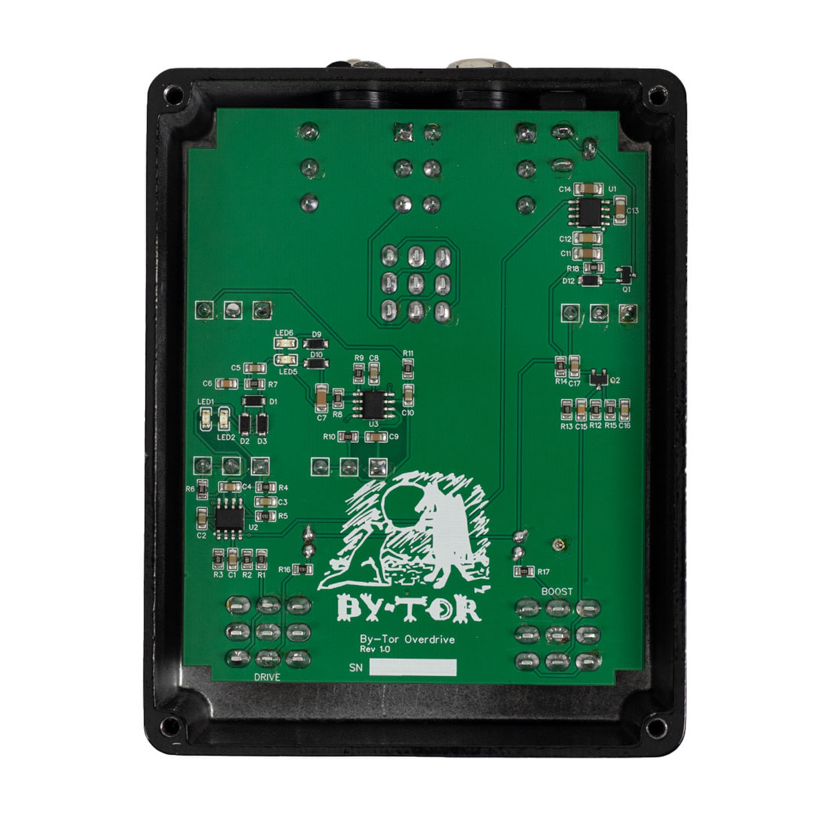 I designed the first prototype boards and had them built using through-hole components in case I needed to make any tweaks to the circuit. I added a fixed boost circuit that came before the overdrive so that it could be used as a gain boost. The circuit was a very simple JFET gain stage with about 3-6dB of boost. Prototype #1 was sent off for Alex to check out.