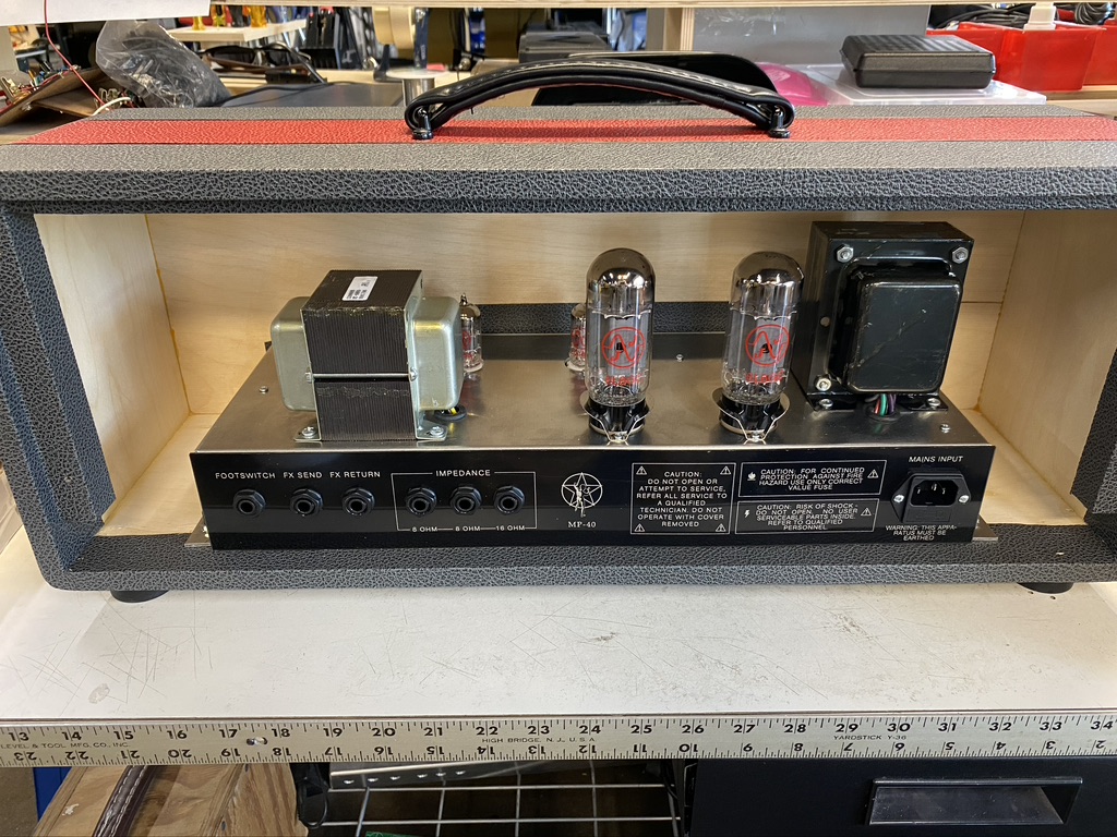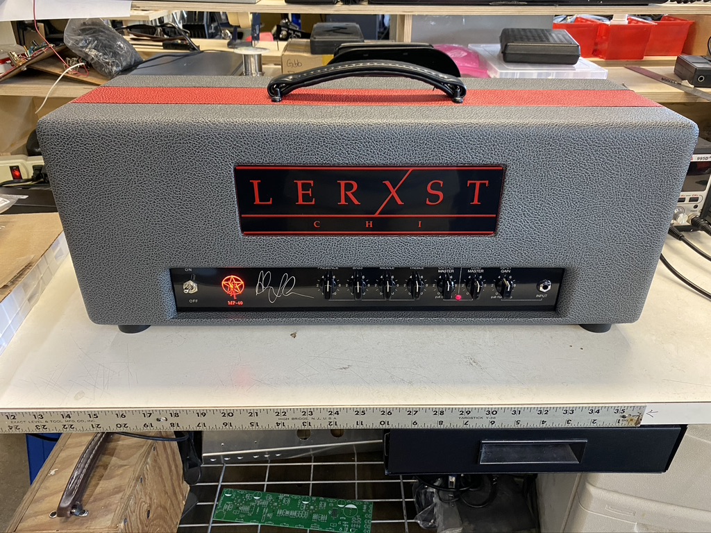 The original Chi amplifier was based around a single-channel version of the Omega but with a pair of 6V6s in the output section, producing around 15 watts. During the re-launch talks, the decision was made to create a higher-powered version and make it a two-channel amp. The idea was that it wouldn’t be just a lower-powered Omega. There were discussions back and forth about what Alex’s business partner thought the amp should be. After much deliberation, the Chi ended up becoming a lower-powered version of the Omega. Instead of using 6V6s this time, as they wanted more power but not the full 50 watts that the Omega was putting out, the amp is running a pair of 6L6 tubes in a cathode bias configuration. The final output wattage came in around 25-30 watts. The bigger bottles helped keep the “big-ness” of the Omega but in a smaller and lighter package.