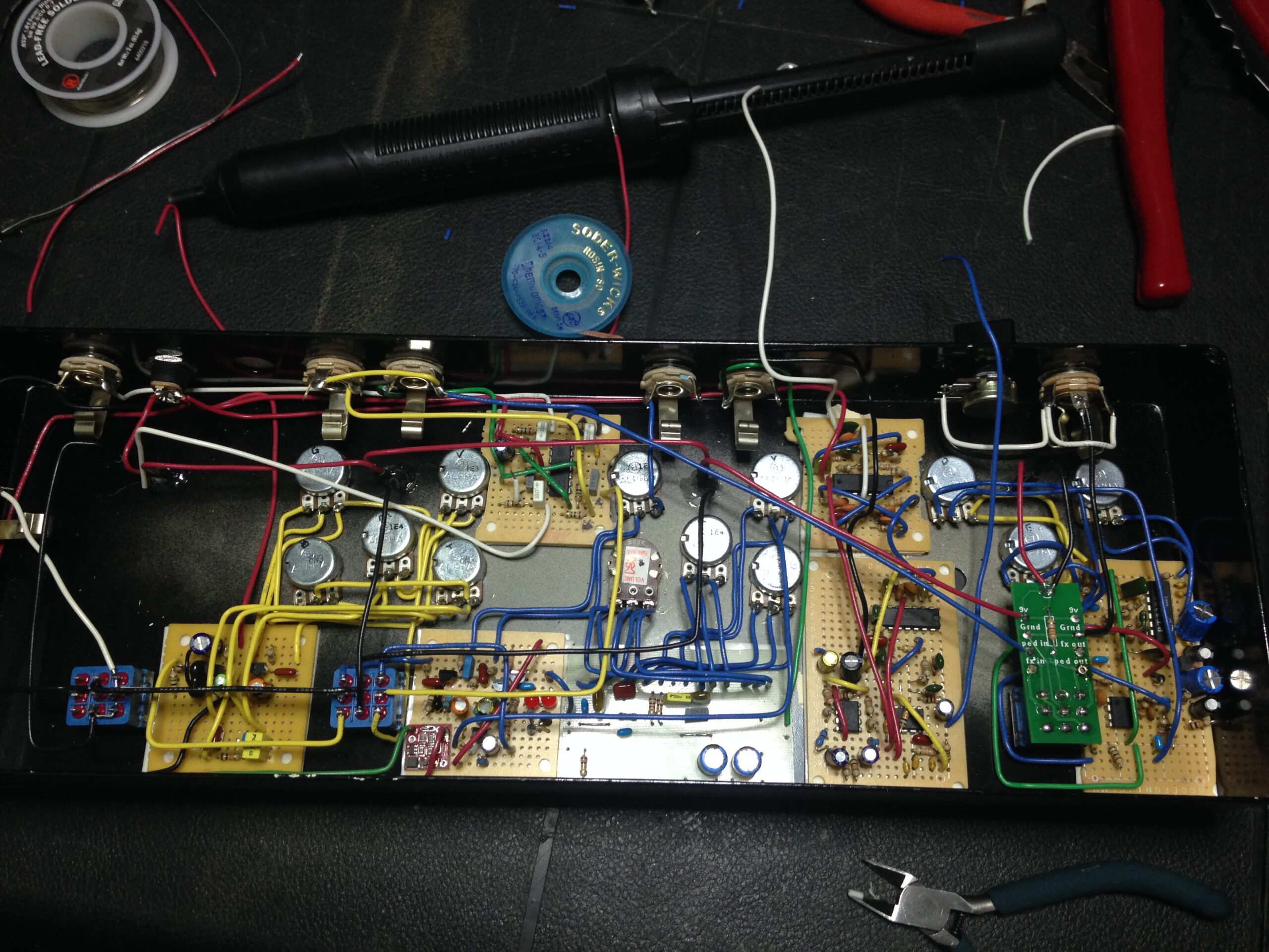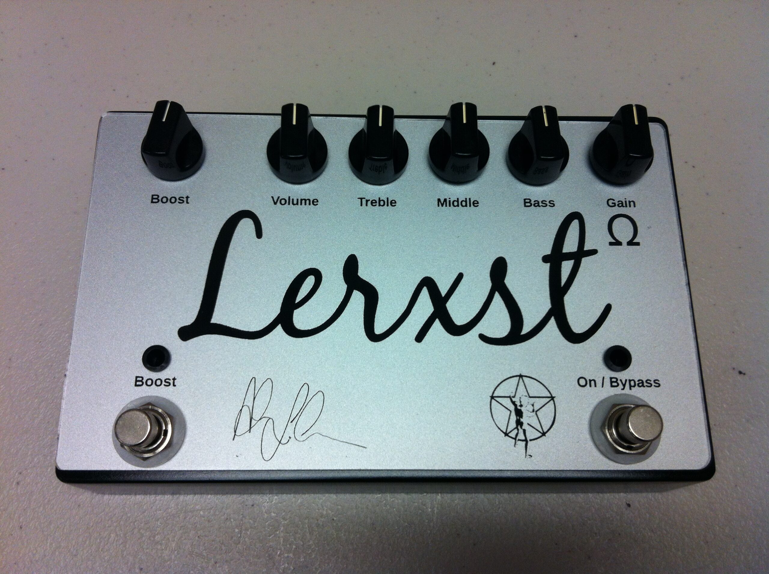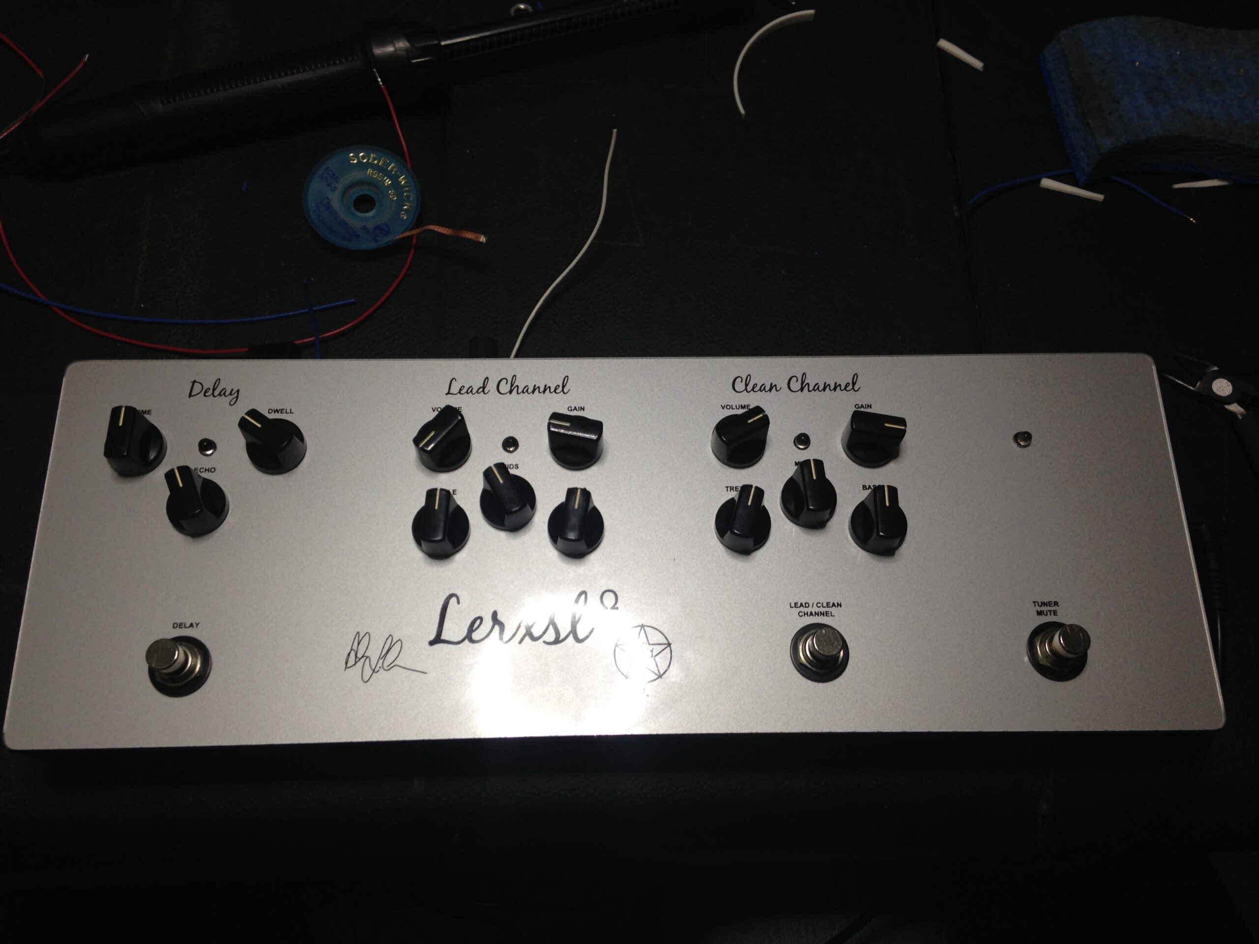 There were two other Lerxst projects that were developed but not released. The first was a Lerxst pedal based around the preamp section of the Lerxst Omega, with an independent Solo Boost after the preamp. I had considered making this switchable for pre or post preamp. The pedal used JFETs as part of the design to achieve the organic sound and feel of the Omega. The biggest challenge with the design was capturing the feel and the roar of the Omega in pedal form. There’s something about the low end and the feel of air movement from a 4×12 cabinet. The original prototype was sent to Alex on the road but needed a few more tweaks before final approval. The last unreleased project was an updated “all-in-one Lerxst in a box” pedal that had two channels, delay, and a direct out with speaker simulation.