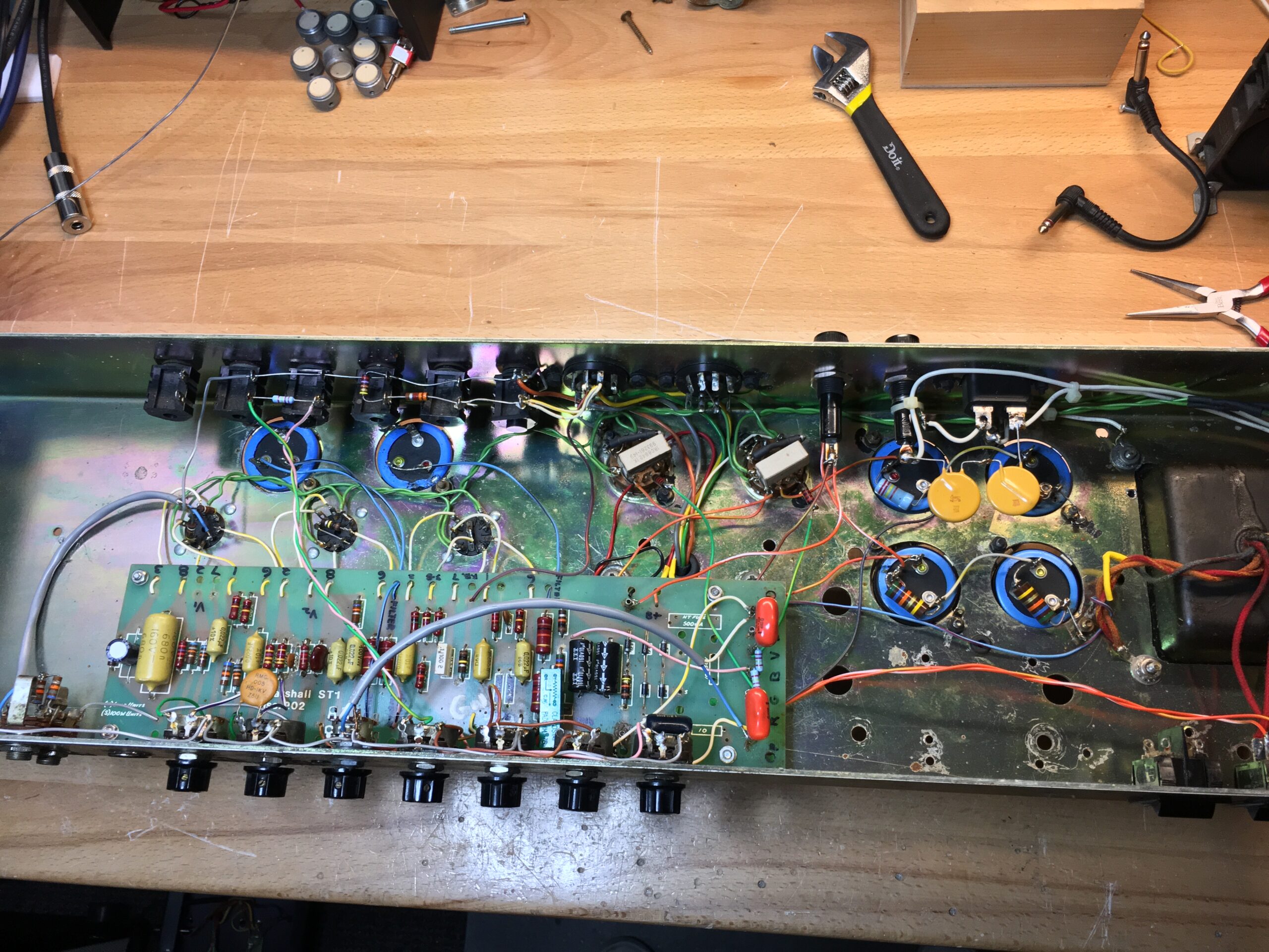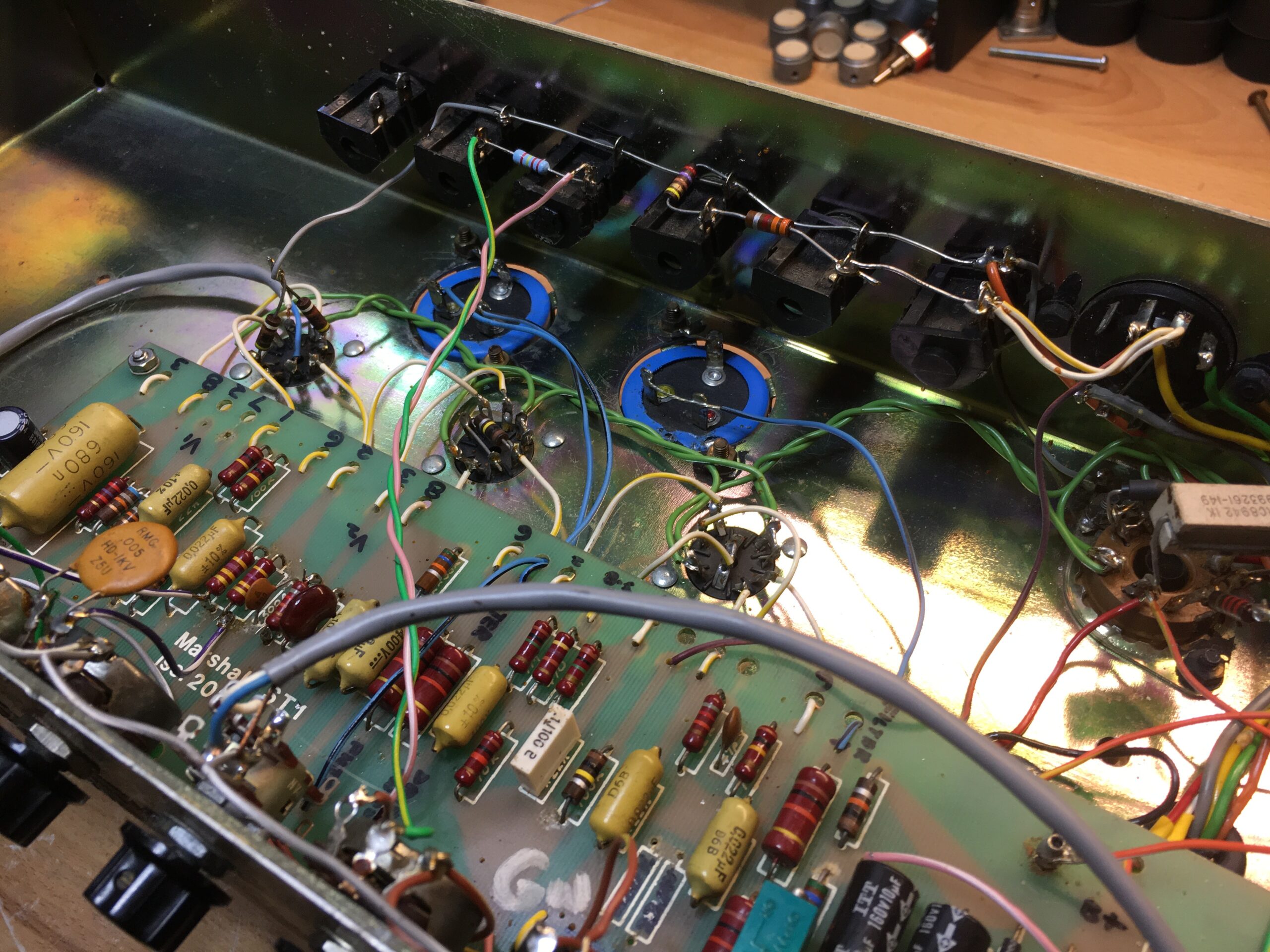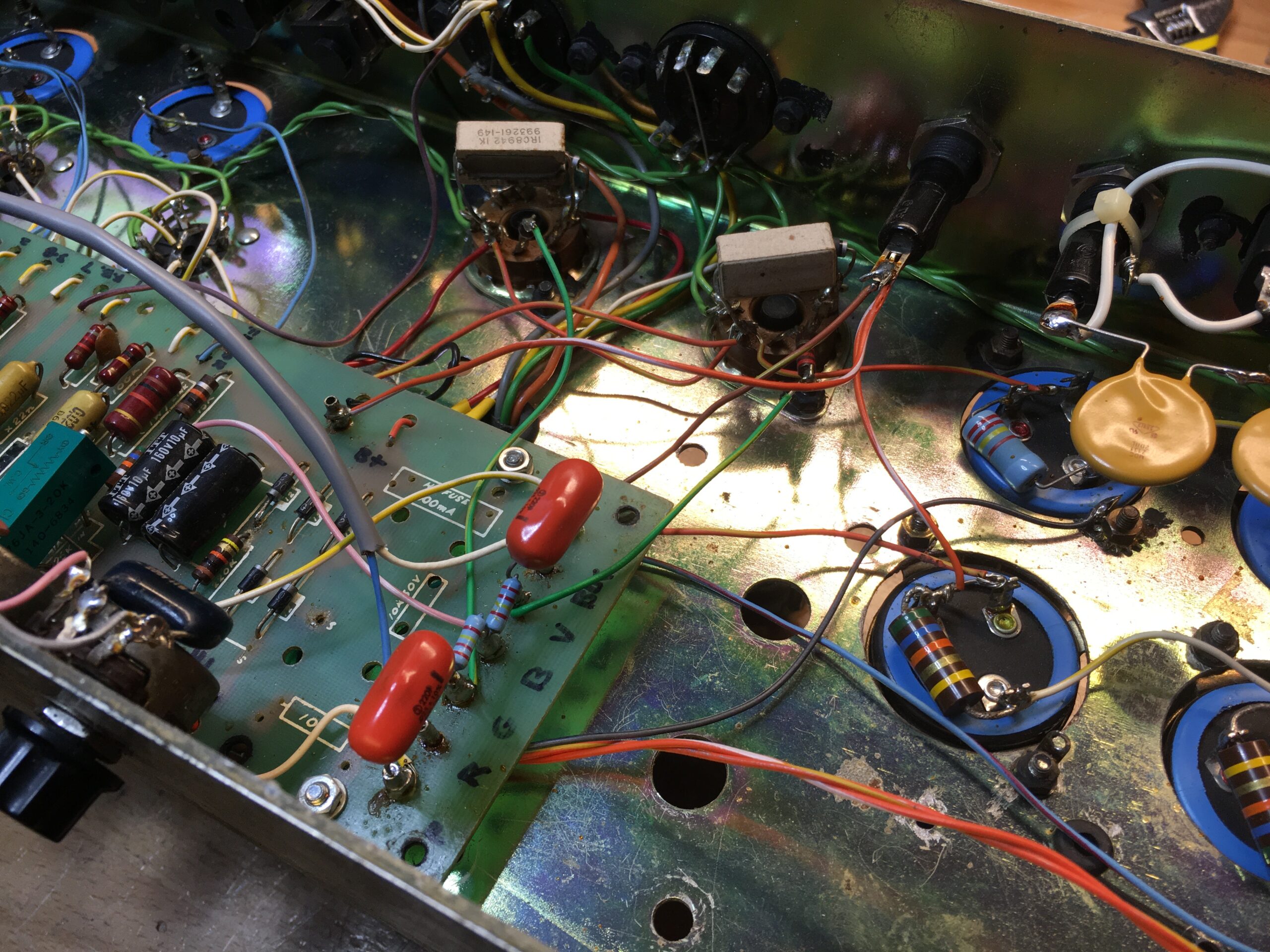 There was one amplifier in the pile that they wanted to be rebuilt. The front panel had several holes drilled in it, the good ole embossing labels, and a random lay-down style power transformer that looked like it was from the 50s. Let’s just say it was a hack job. For whatever reason, someone decided to take the guts out of the 2550 (Silver Jubilee) and replace it with a hacked-up 1959 circuit board. All of the capacitors were changed to a much higher value in the power supply, and extra caps were added that would normally be in a 100W Marshall circuit. Looking further, the area where the current power transformer was hacked in used cloth-covered wire for the leads and showed some signs of rust. I was able to figure out from the date codes on the bell of the transformer that it came from a late 50s low-power Tweed Twin.