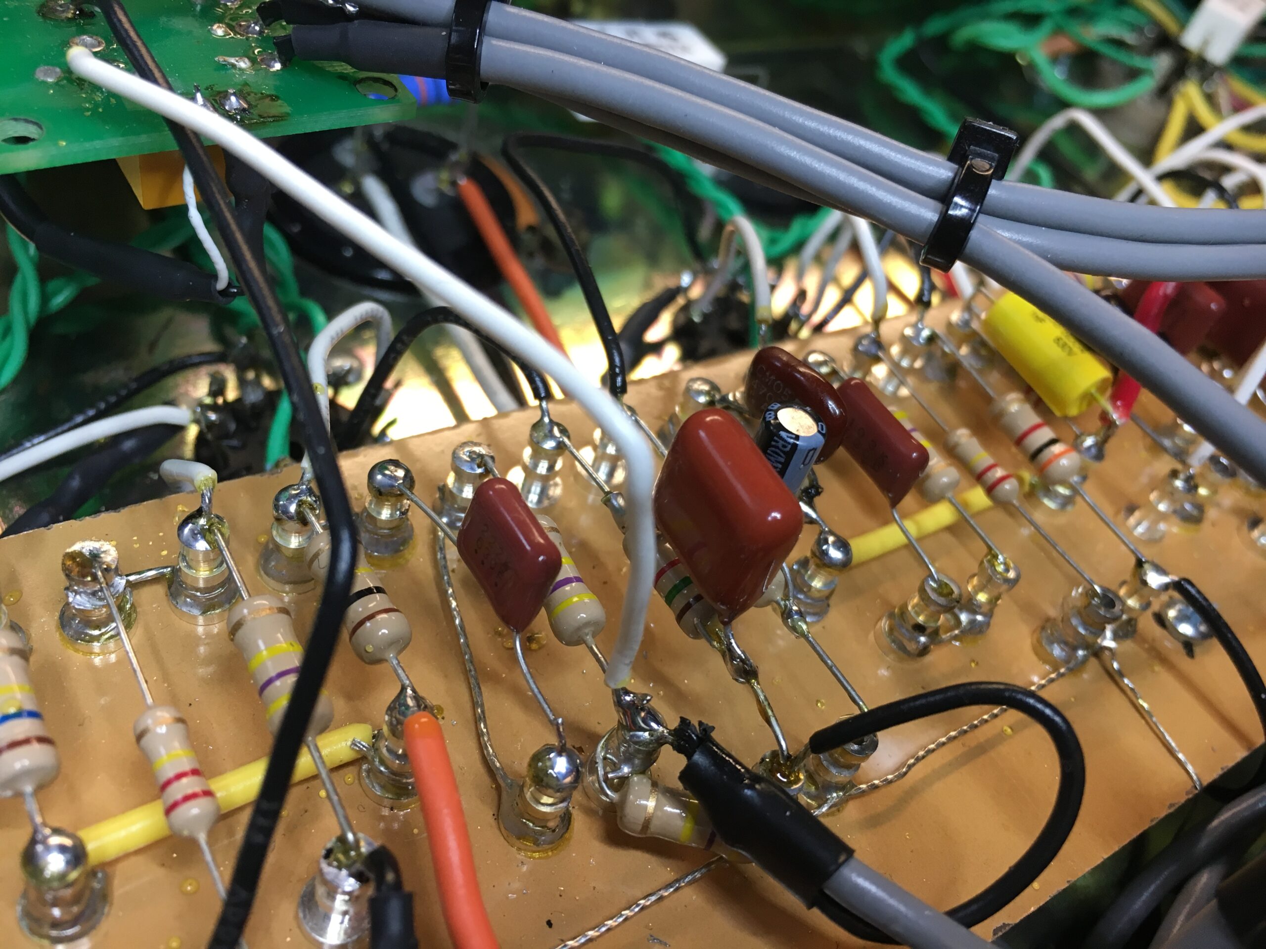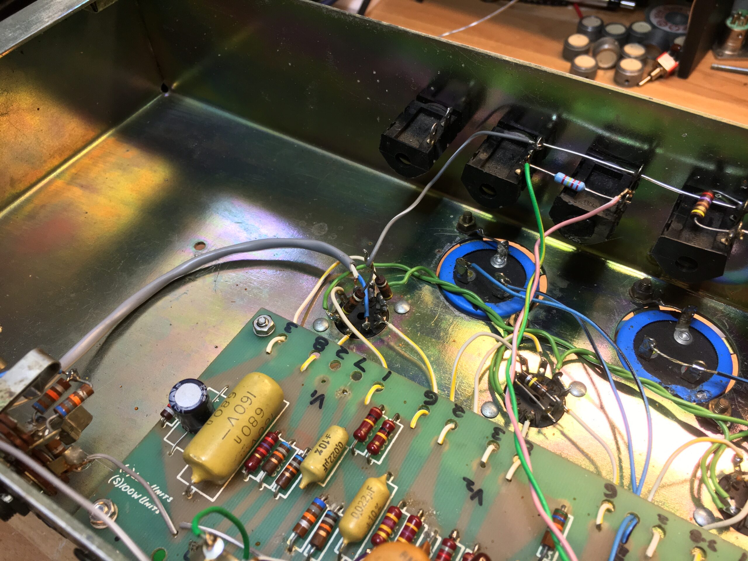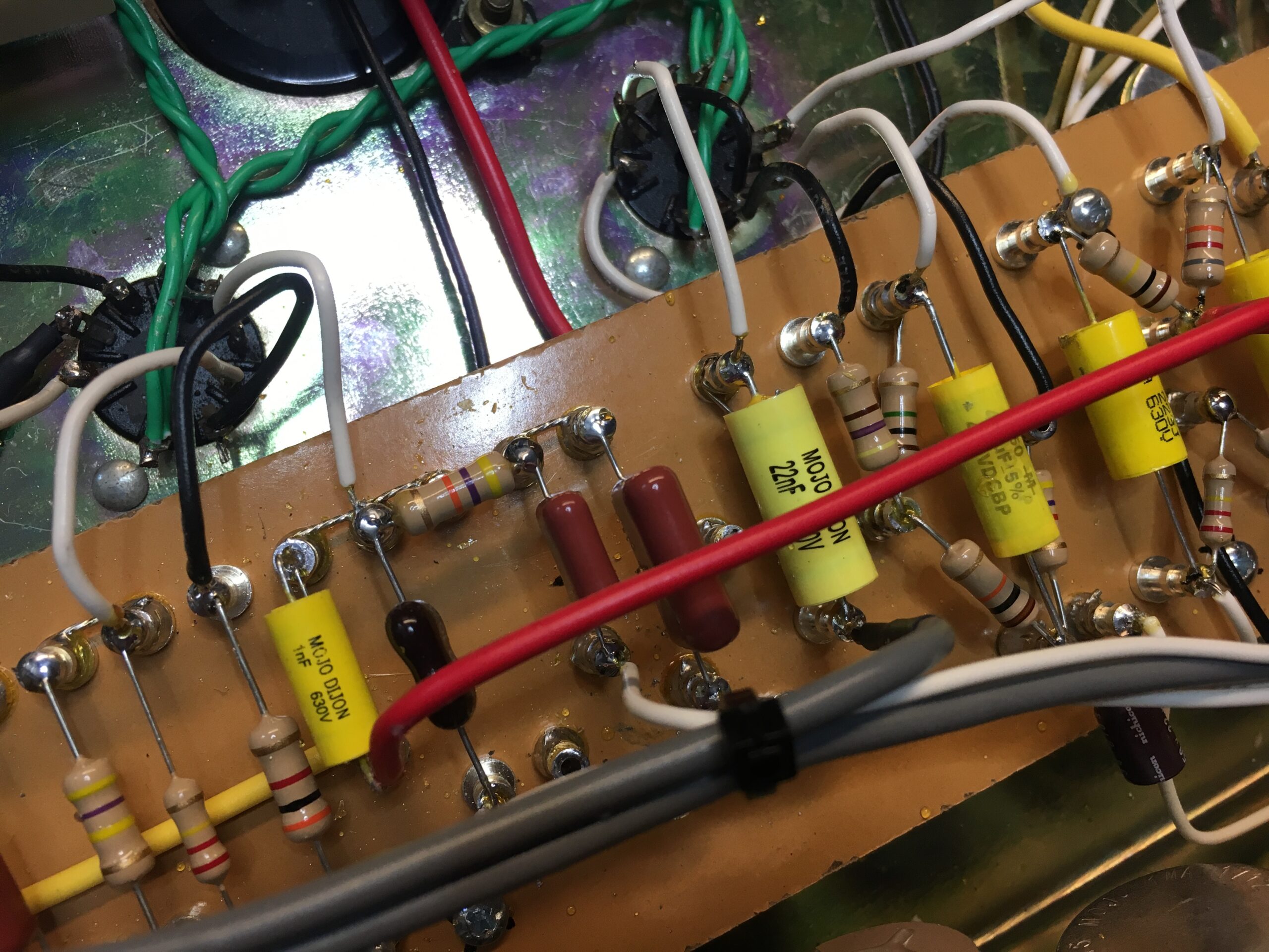 They requested to add an FX loop to the amp for using delays and reverbs for solos. I started with the Mojotone effects loop and then further tweaked it for unity gain as well as reducing hiss/noise. The loop uses two LND150s running at high voltages for clarity and to handle large audio signal swings from the preamp. The tweaks that I made for the loop on this build, as well as some further revisions, I later used to design my own effects loops for repairs and builds.