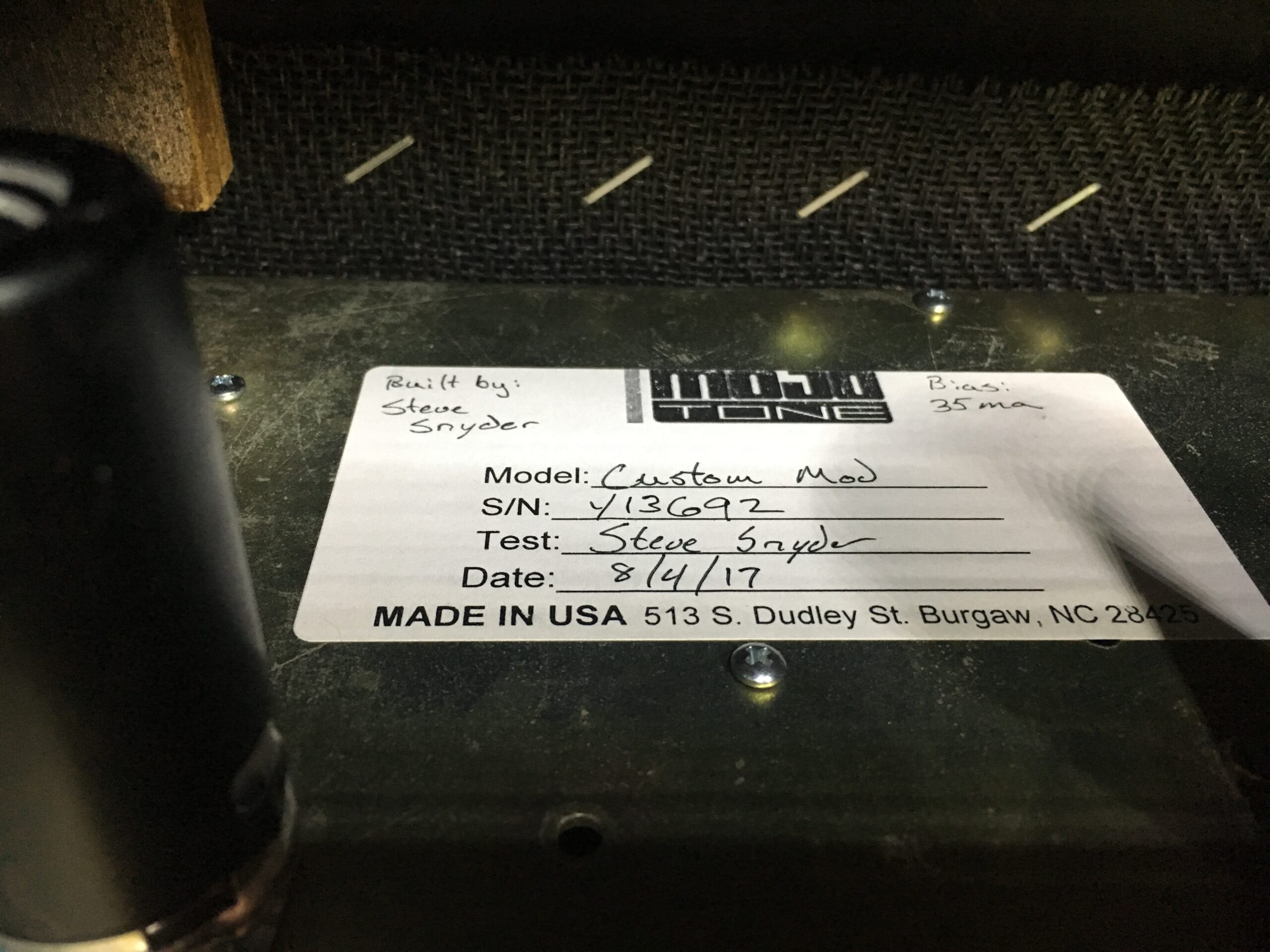 After the amp build was completed, they requested that the amp be given the name Dennis. I don’t recall the reason for this name, but a new Marshall gold-style faceplate was created with the name on it. The amp was put through the ringer at Mojotone before sending it out. The amplifier now lives at Shinedown’s studio and has been on several of the last records to come out of there.